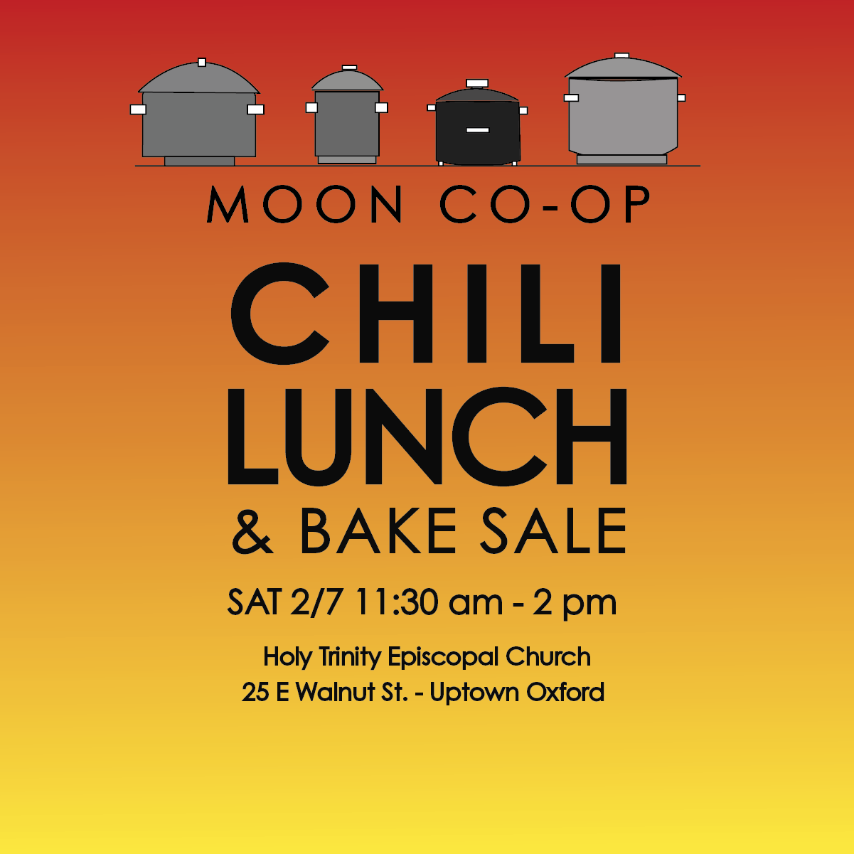 We are delighted to bring back MOON Co-op’s annual Chili Lunch Fundraiser, to be held on February 7 from 11:30am-2pm. We hope you can support this year’s event by making a chili, baking bread or dessert, or contributing to the event’s bake sale.
